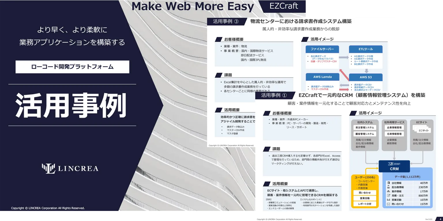 短期間で複雑なアプリケーション開発ができる、ローコード開発プラットフォーム「EZCraft」を活用した事例集。